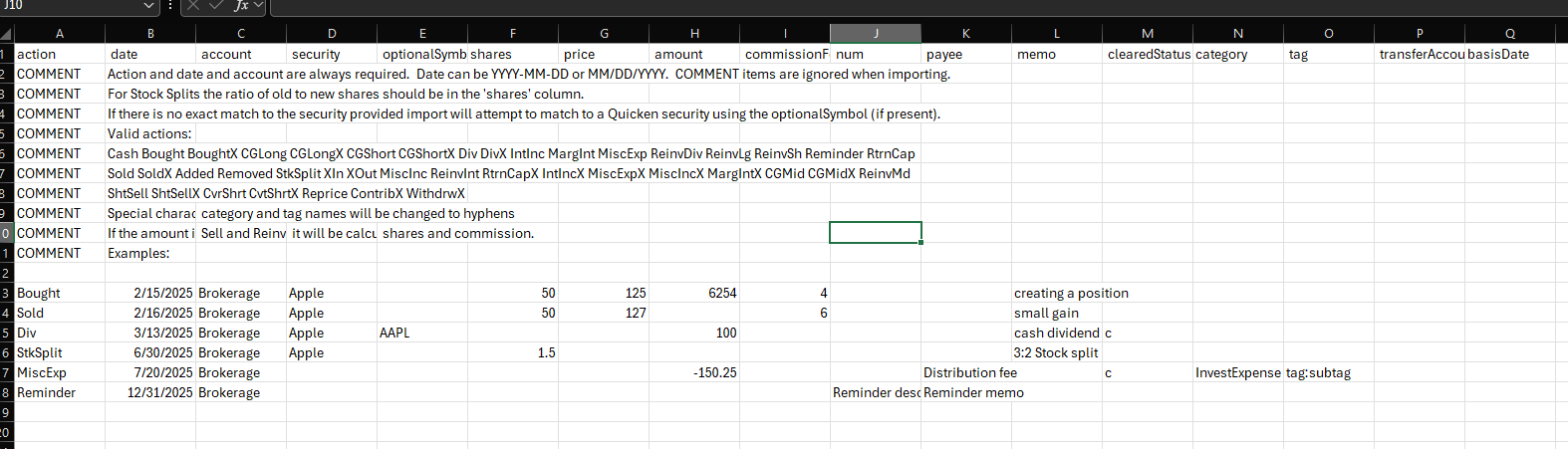 For instance, there isn't any standard on the terms used for the security actions. In fact, I have seen financial institution CSV files that don't even have an action column. Bought and Sold are in the example and work but Buy and Sell don't. The financial institution has to magically use the same terms that Quicken uses.