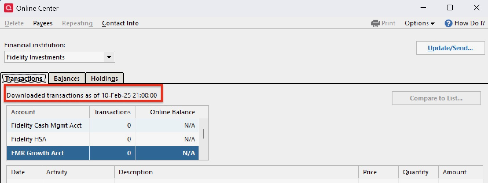 Do you see that same 10 Feb date regardless of which Fidelity account you look at, or is it limited to just the one in the screenshot (FMR Growth Acct)? Have you navigated to Tools>Account List, selected Show hidden accounts (if the option is visible) and checked for any possible duplicate accounts?