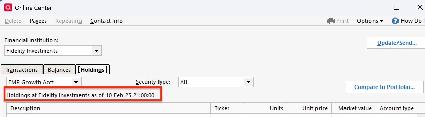 Here is a recent example: I have one account at Fidelity with one security. I purchased this security in September of this year, and my Quicken register clearly has all of the associated purchase details. Yet - when I use the Online Center tool to compare securities - this is what I see: