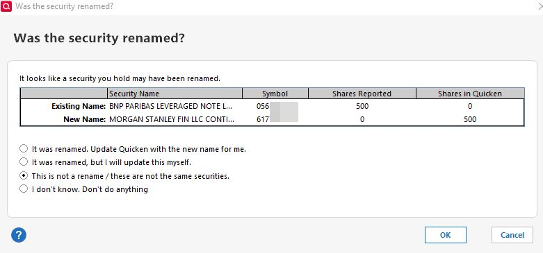 Below is one of several MLN accounts. Quicken frequently thinks I need to fix this. They don't even have close to similar names or CUSIP/symbol. [Removed-Rant]