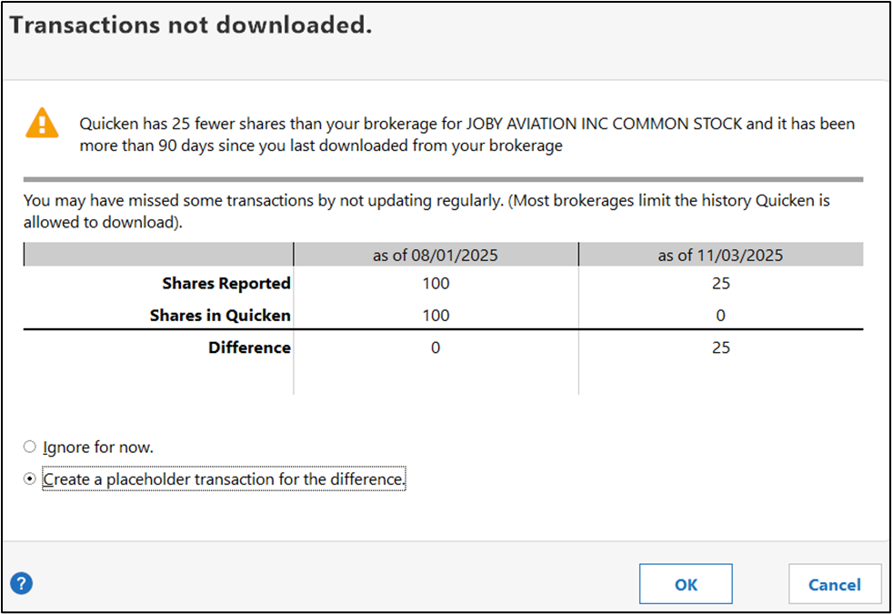 What I am seeing in this pop up is that there appears to be a missing Sell or Remove shares transaction (or transactions) totalling 75 shares dated somewhere between 8/1 and 10/31. Manually enter the missing transaction(s) or do an Add Shares transaction for the missing shares quantity (dated between 8/1 and 10/31) and this shares mismatch popup should no longer exist.
