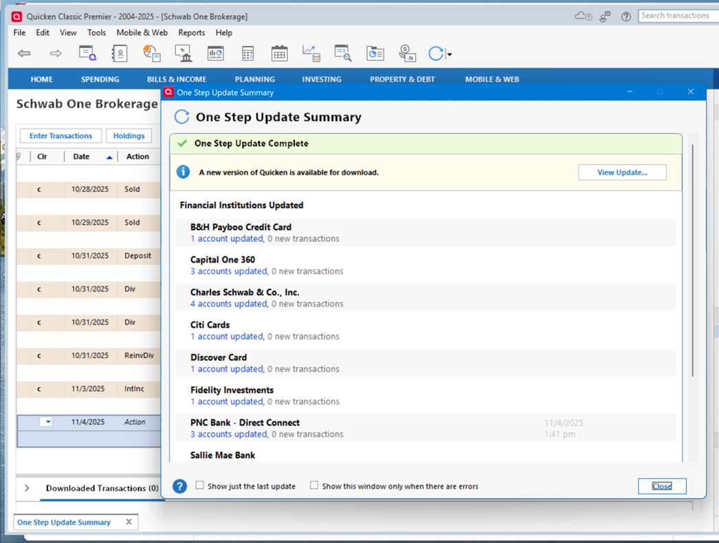 One Step Update is not showing the Express Connect and EWC+ accounts as updated with the time and date at the right. The updated accounts are not showing the update time and date at the top left of the window under the Account Title either. So, did the EWC and EWC+ accounts actually update???