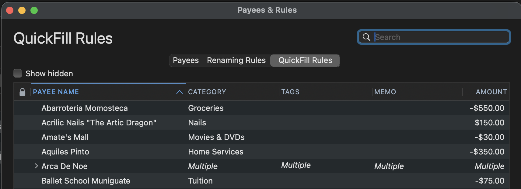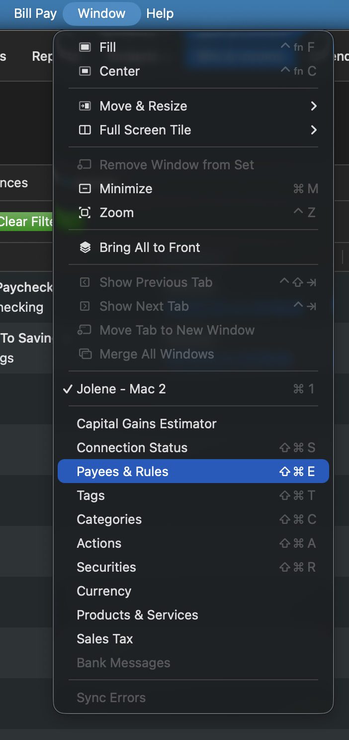 - You can check this by going to Window>Payees & Rules>QuickFill Rules. Look for the affected payee.