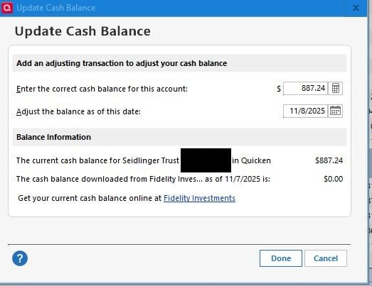 - Quicken Windows users may need to change the Money Market representation if they are not prompted. You can do this by clicking the Cash link in the account or in the Account Details>Online Services Tab, the “Reset Money market securities/cash options to trigger the choice of cash or security again. The cash balance will still be the same that Fidelity reported for the one or more money market securities they have.