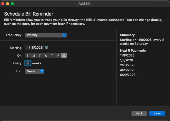 Thank you for coming to the Community to share your feedback! While there isn't currently a custom frequency option, there is a lot of flexibility with the existing options. For example, with your every 8 weeks bill, if you choose Weekly for the frequency, you can then choose the day of the week and how many weeks between bills.