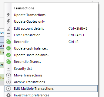 That said, if you want to mark all transactions as reconciled, click the gear icon and choose Edit Multiple Transactions.