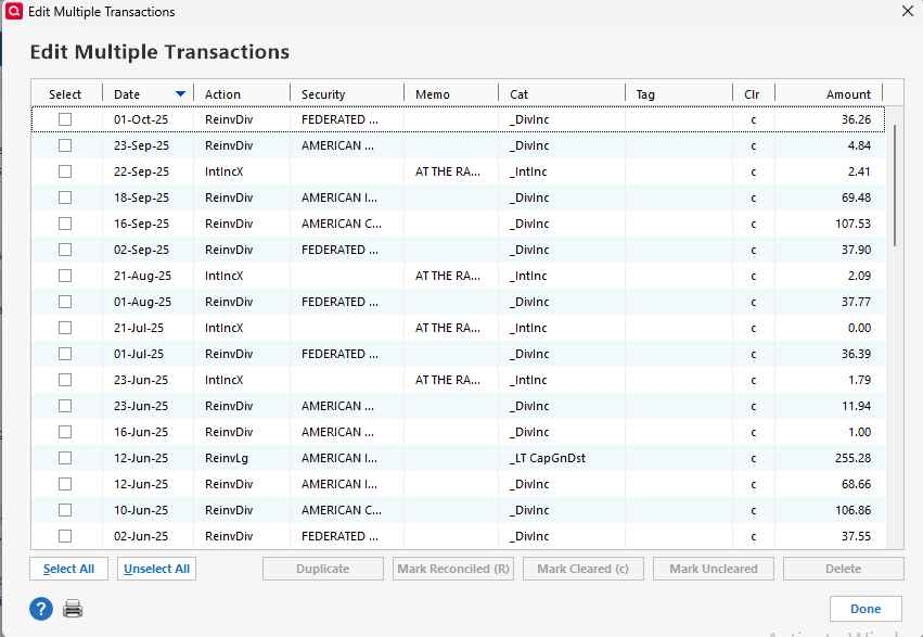 1. One of my Fidelity accounts is a CMA-linked Brokerage account to a Cash Account. When the Cash Account is reconciled the linked Brokerage transactions are not marked as reconciled. The only current method of marking the Brokerage Account transaction as reconciled is to manually select each transaction and then select R. Why can the option to select ALL transactions to mark them reconciled like other accounts? The better option would be to mark the Brokerage transactions as reconciled when the transactions in the Cash account are reconciled.