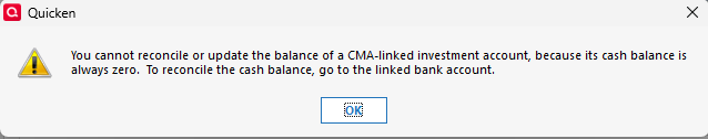 Thank you for reaching out. To answer your questions, when there is a linked cash account, the regular reconcile function won't work in the investment account portion because the cash balance is always zero.