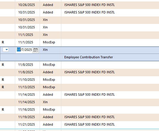 As you can see there are Xin for the contributions, and there is a MiscExp for recording a difference in the cash amount reported by the financial institution and what is in Quicken (as in money comes from paycheck, financial institution reports there isn't any cash (because shares are being bought) so a MisExp removes the cash.