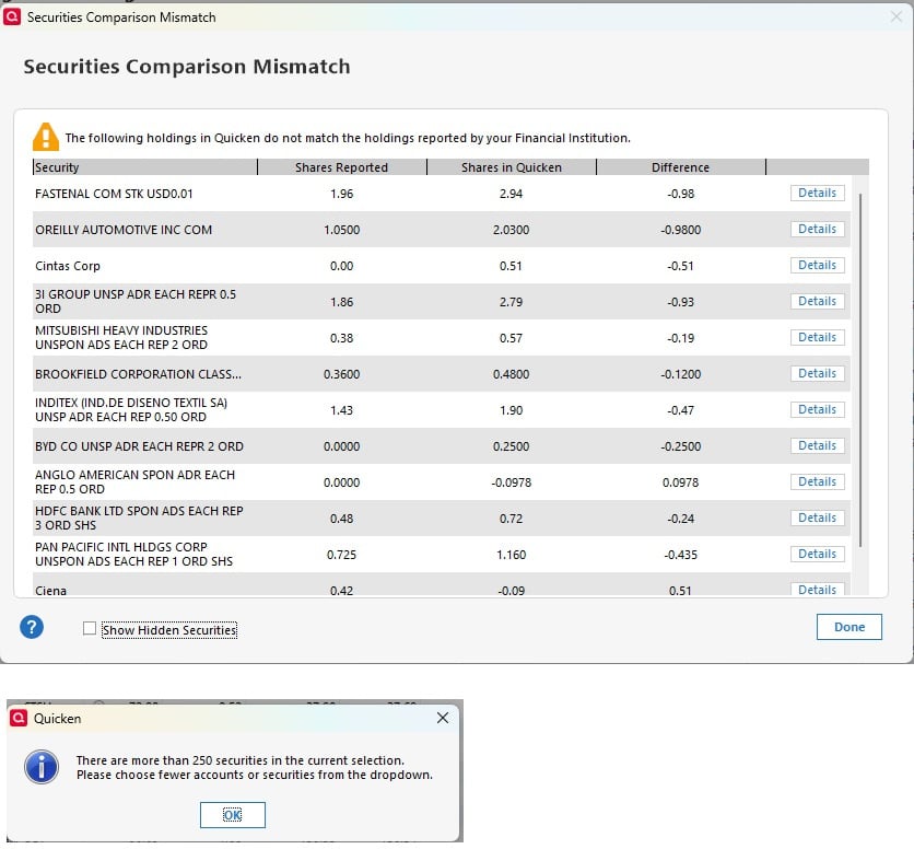 One thing I wasn't sure is clear in my comments. On your original comment the problem was the security mismatching. With Simple investment mode you would never get that because the way you get that mismatch in the first place is because Quicken looks into what you have in your Quicken register and compares it to the "summary information of the number of shares the financial institution says you have" and when there is a difference reports it. But in the case of Simple investment mode, it does the same comparison but instead puts in add and remove transactions into Quicken to match what the financial institution sent. So, by definition you can't have a mismatch. But note that is all based on the assumption that the financial institution does send the right "summary information".