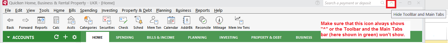 There's an icon at the upper right-hand corner of the Quicken Window. It usually is set to show as "^".