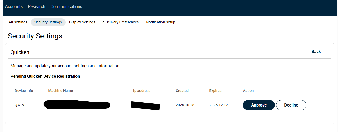 Our teams have requested that, in addition to submitting new logs (if you haven’t already), you please verify your credentials by logging into investor.pershing.com. Once logged in, navigate to the Settings page and verify your information to link to Quicken.