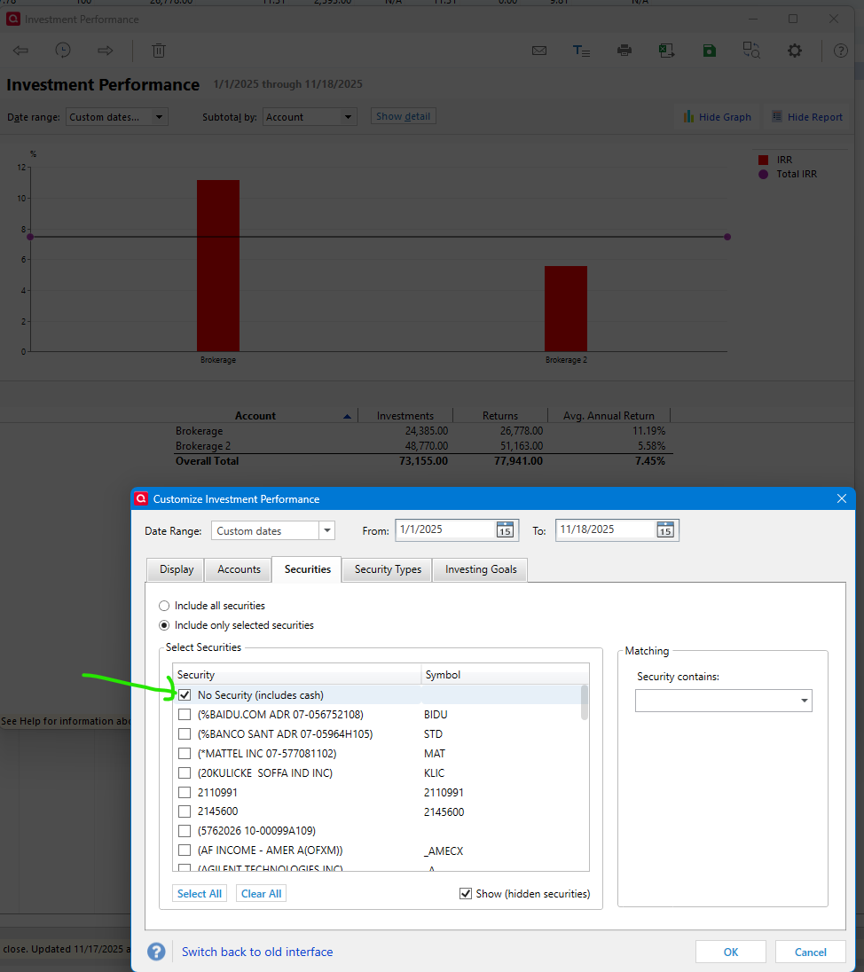 @Quicken Kristina It doesn't matter what type of investment account it is. The Portfolio Value filter shows Cash; for Performance filter does not. I believe it's just programmed that way. My guess is because Cash doesn't have a Basis or Gain/Loss — interest paid is not tracked as a "gain" for cash — the programmers did not include it in the Performance view.