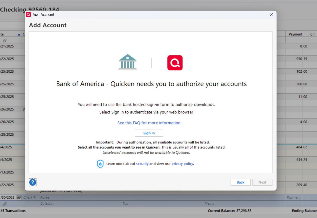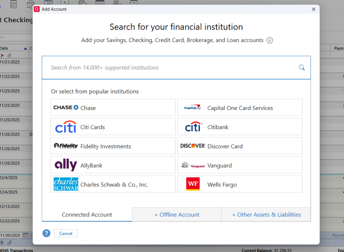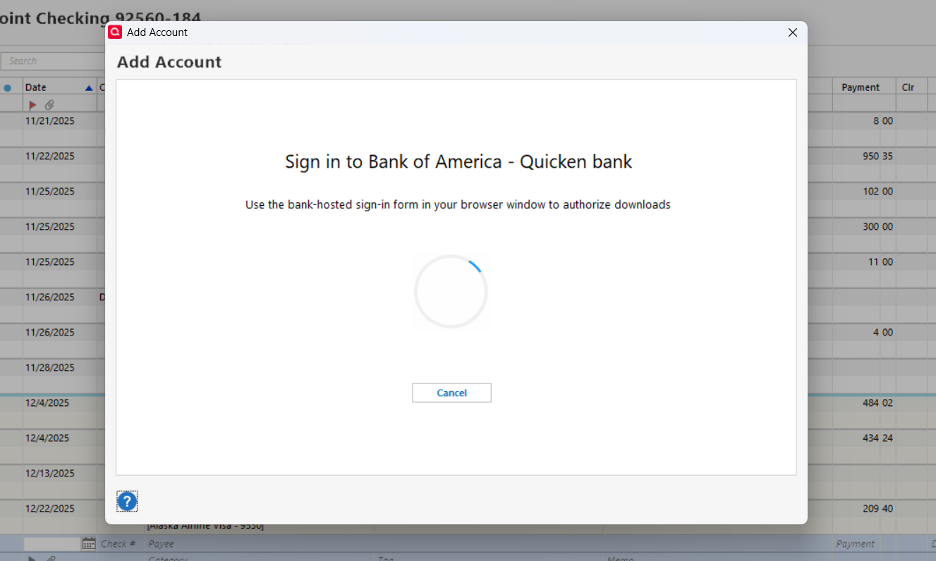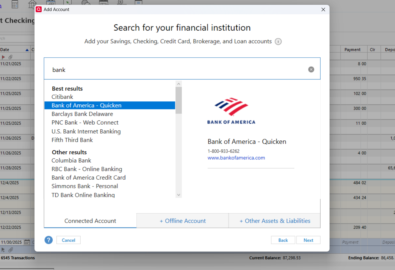 When I try to set-up online stuff, Quicken cannot seem to connect to the bank. I have a separate query/post on this today (11/30/2025). Actually I cannot connect to other institution either. But for some reason I am able to do a QFX file import from those, non-Bank 0f America, institution.