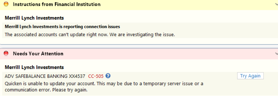 For the last 2 days I haven't been able up download transactions from Bank of America and Merrill Lynch. I get the following error messages for all 9 accounts. A quick search on Google and here doesn't seem to report this problem. Is anyone else seeing it.
