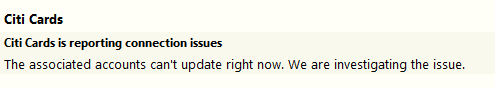 Except Citi is downloading all transactions accurately. More of an annoyance than a concern, unless it indicates some pending issue. Is anyone else seeing this message?