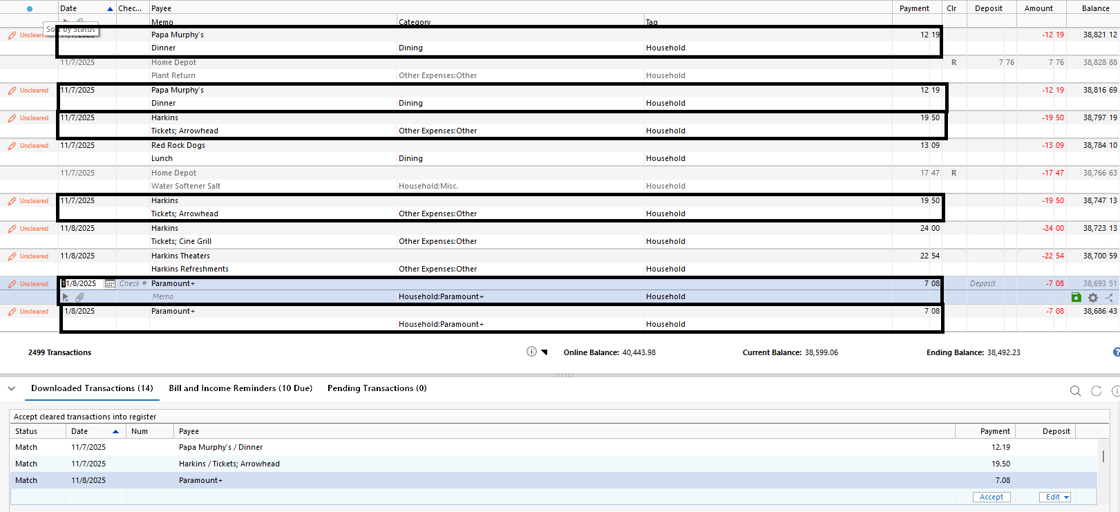 - While holding the Ctrl key on your keyboard, click each of the duplicate transactions in the register.