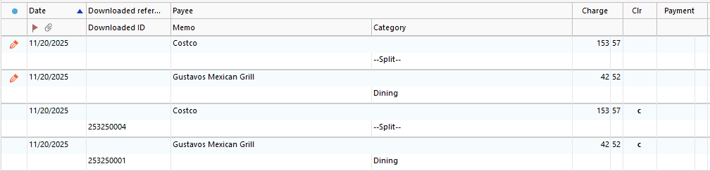 Downloaded transactions appear twice, with different Downloaded IDs.