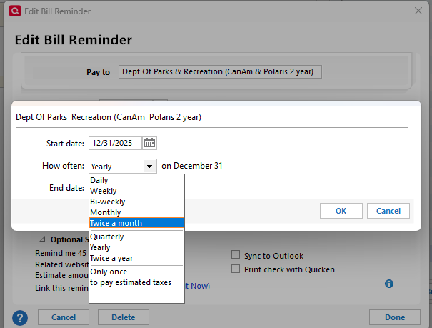 I'd like more time options here, or a custom option to set any interval I want. I have several bills that do not fall in any of the current options.