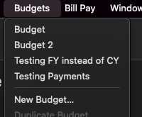 When you click on Budgets, from the menu or in the program, it will give you a dropdown showing any existing budgets you've created, an option to create a new budget, and options to duplicate, edit, or delete your budget (if applicable).