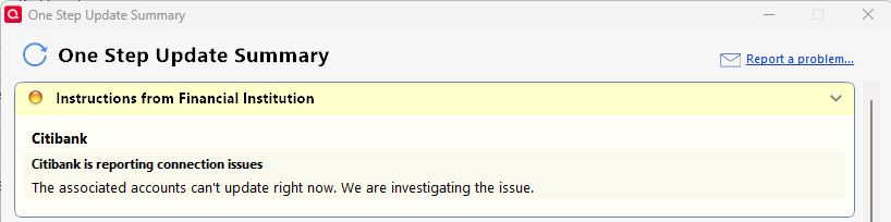 What’s unusual is that I get both an error and a success message in the same One Step Update. The error appears first (see screenshot showing “Citibank is reporting connection issues”), and directly below it Quicken also says the account updated successfully.