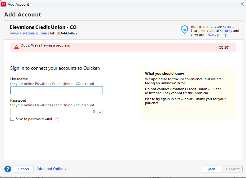 We do have a Known Issue for CC-501 with some banks; however, Elevations Credit Union isn't known to be one of those.