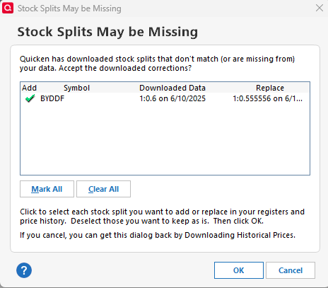 Here's my take on what seems to be happening: One Step Update pulled in wrong information from Quicken's third-party data supplier back in June, and treated the phantom BYDDY 6:1 split that you see as if it were a real split belonging to BYDDF. Once that happened, that bad split became part of Quicken’s historical data for BYDDF. Now One Step Update checks against that same incorrect history and repeatedly flags the phantom BYDDY 6:1 split as a "missing" split for BYDDF. Because of that, Quicken will continue show the alert indefinitely until there's a patch or other fix. For now, you (and I, and anyone else having this BYDDF problem) will need to keep clearing or dismissing the “Stock Splits May Be Missing” message after each One Step Update.