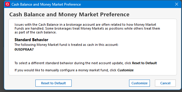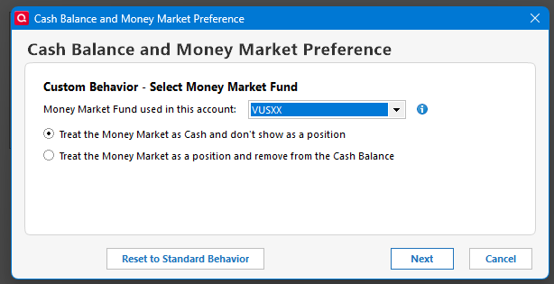 I ask because in one account it correctly identified the SWVXX for this purpose, but in another account the drop down selection was empty - where I expected to see VMFXX. I checked the downloaded prices and all were $1.