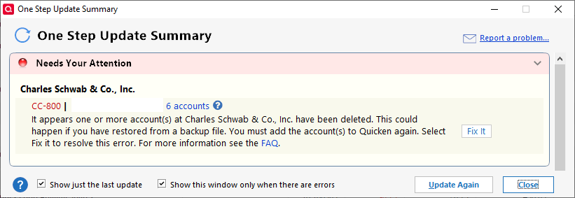 CC-800 Error Message Updating Accounts from Charles Schwab