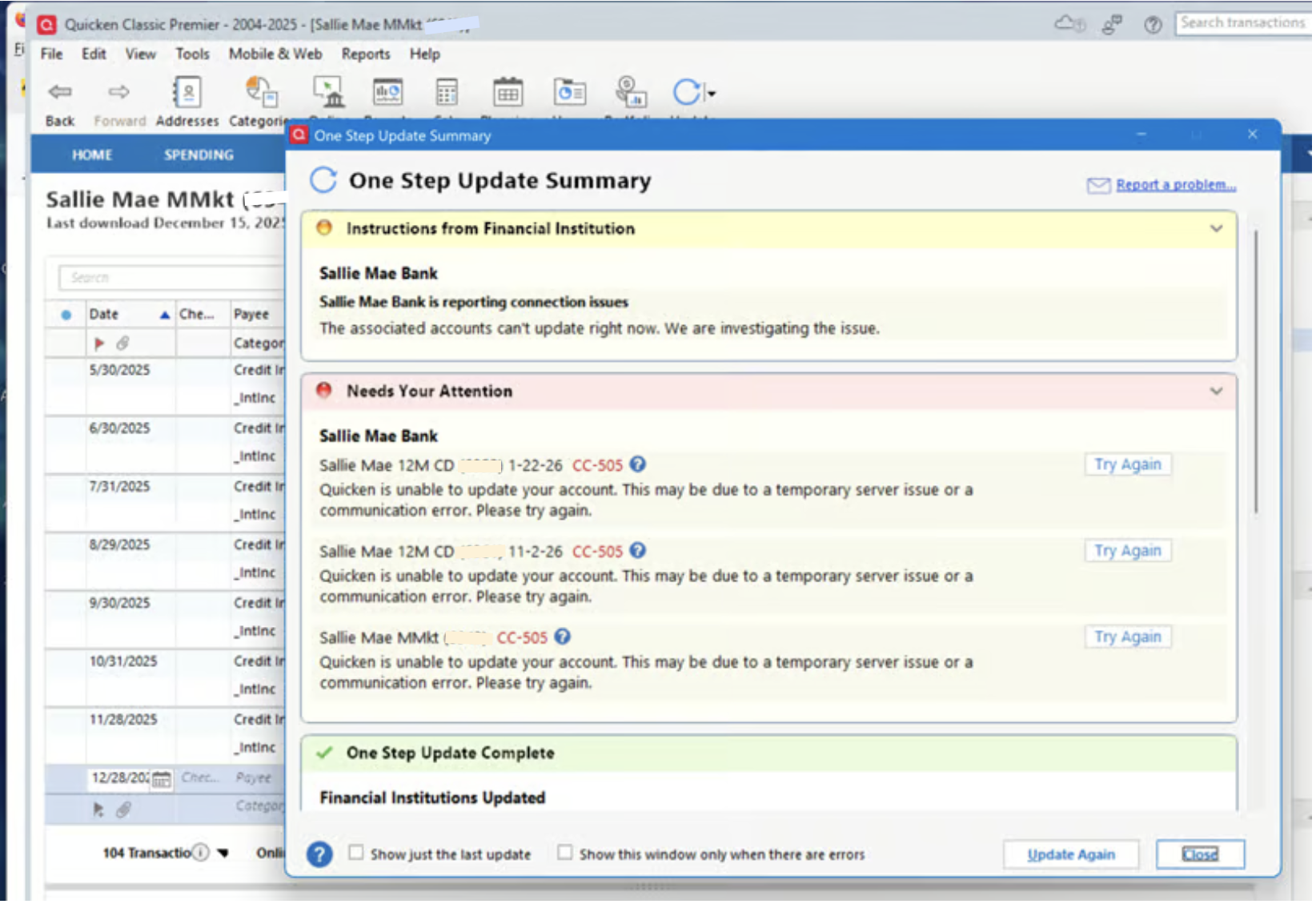 1/11/26 - Sallie Mae update is broken for me as well. Two savings accounts and one CD. Worked fine for years but stopped working 2-3 weeks ago.