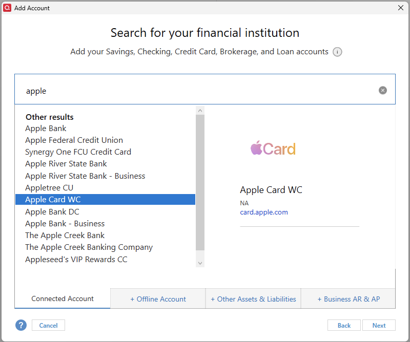 We actually do support Apple Card. The instance on Quicken for Windows is Apple Card WC.