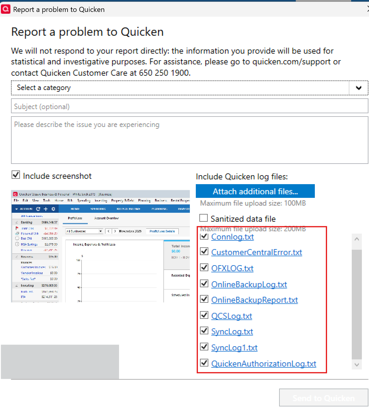 It would also aid the investigation to include a sanitized file when submitting the problem report. A sanitized file removes personally identifiable information so you can comfortably share it with the Quicken team.