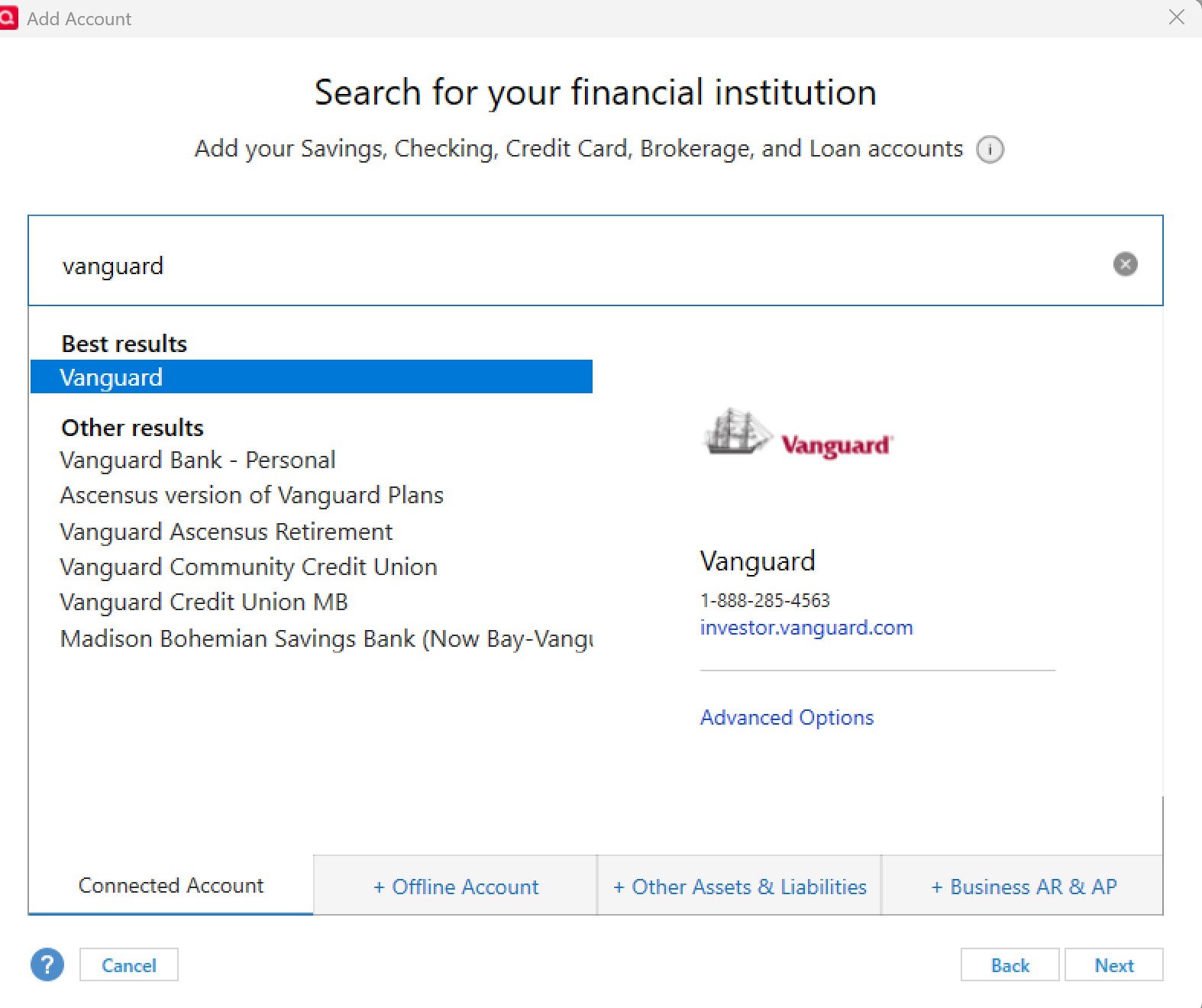 Before we do, please confirm that this is the Vanguard instance listed in our Financial Institution list that you are using, as shown in the image below: