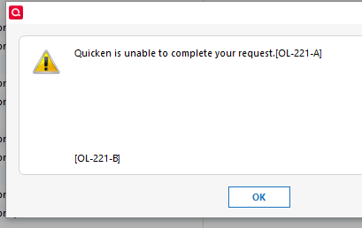 Today when tried importing a downloaded a QFX file from Vanguard, I received the error message: "Quicken is unable to complete your request.[OL-221-A]"