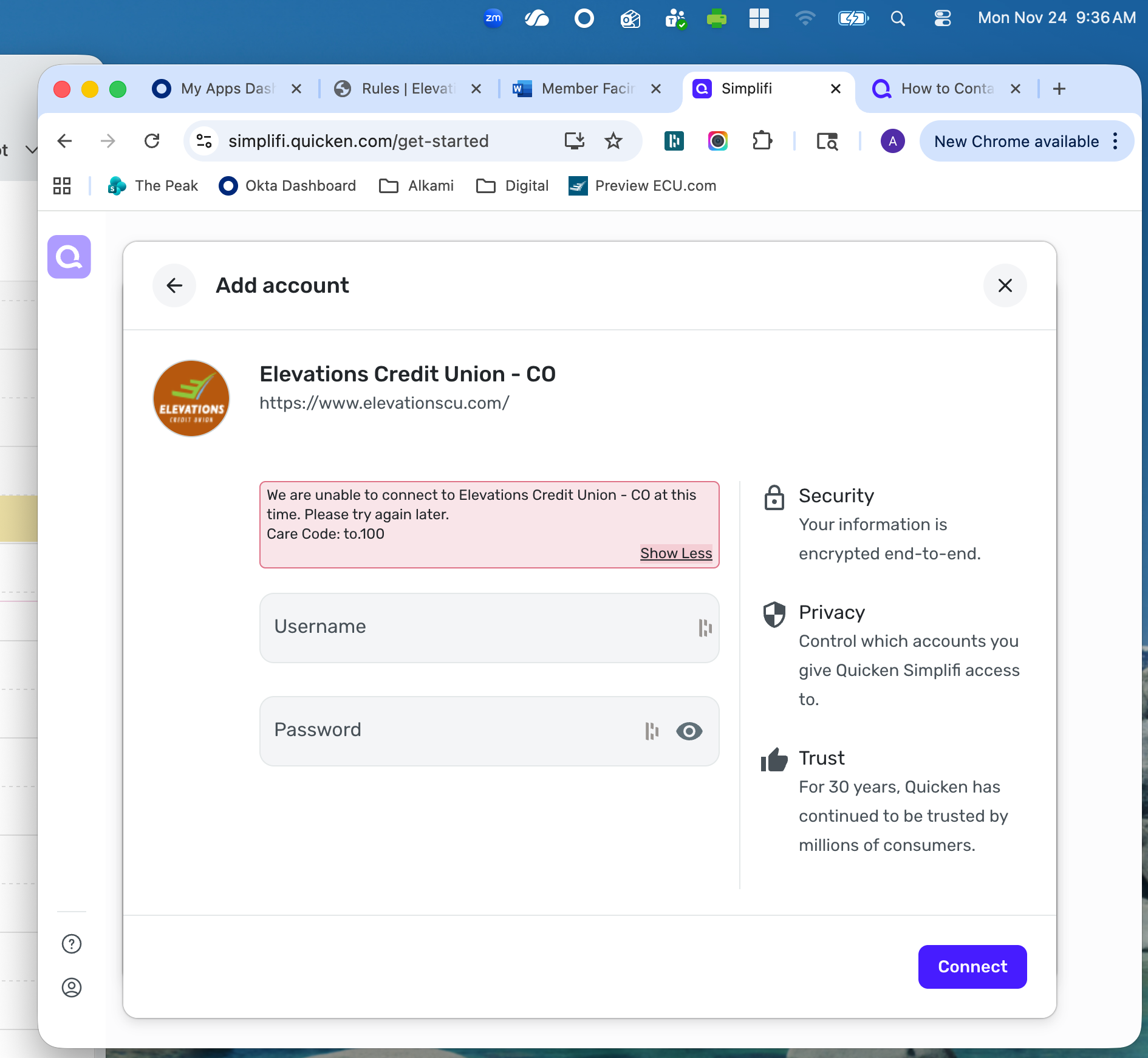 Hello - I work at Elevations and we are also trying to help get this resolved for our members. Today's error is Care Code: to.100
