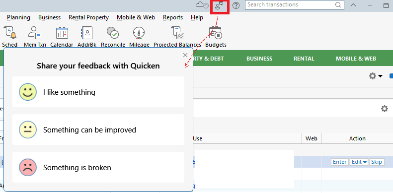 Or are you perhaps talking about this little icon in the upper right hand area of the Quicken for Windows view? When clicked it gives you this dialog for starters: