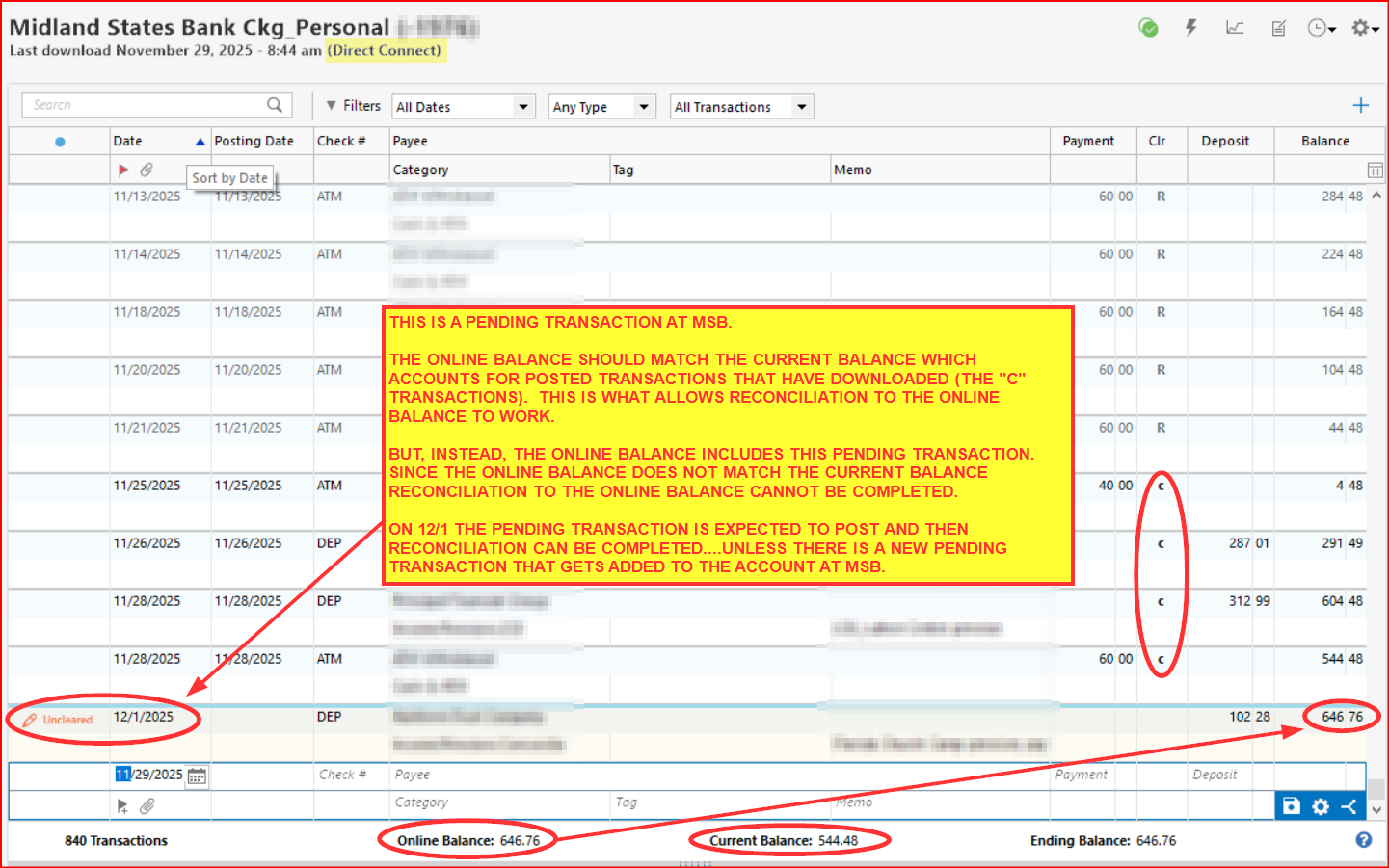 Update regarding the account issue shown in the picture I posted on 11/30: The pending transaction posted and another transaction posted last night. This morning they downloaded and I was then able reconcile the account to the online balance.