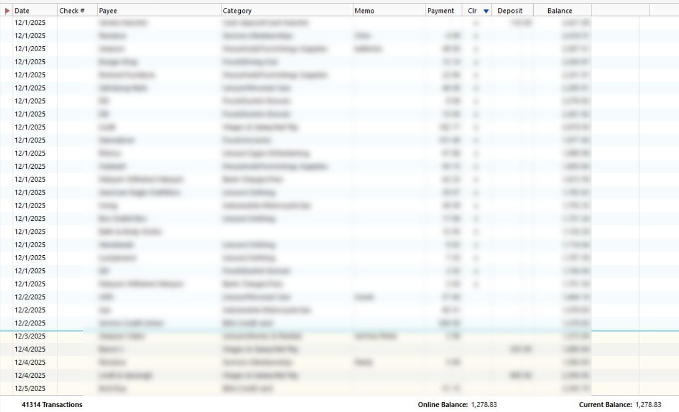 - The affected transactions marked as Cleared (C) but still not reconciling