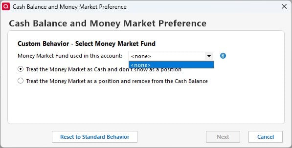 I installed the 65.17 update on Windows and tried to customize the new feature that lets you specify a money market fund that should be treated as cash rather than as a separate position.