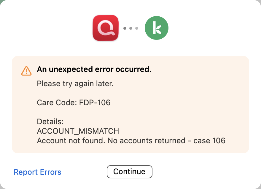 Thanks for the details and screenshot. An FDP-106 error usually happens when the financial institution has changed something on their end—like the account name—or switched to a new account.