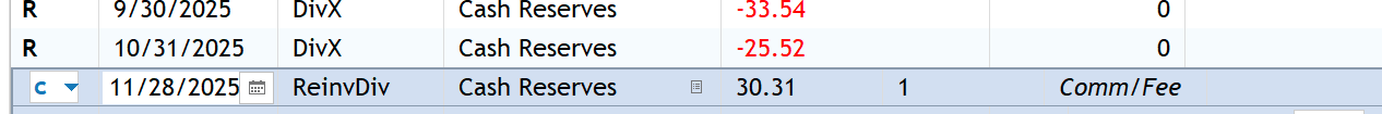 The graphic is from my taxable brokerage account, which has "Show cash in a checking account" turned on, thus there should be no cash in the brokerage account and the action should be a DivX, like the ones above it.