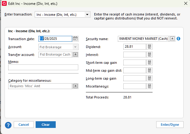 • I edited the transaction in the brokerage account. I made no changes and I clicked on the “Enter/Done” button. The brokerage account still looked fine.