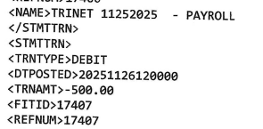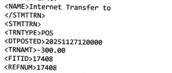 I started having issues importing my banking transaction downloads a few weeks ago, but I have been using Quicken and importing my banking transaction downloads successfully for years. The file I downloaded today has the missing transactions (one on 11/26/2025 for 500.00, and another on 11/27/2025 for 300.00) that Quicken did not import. The financial institution is Randolph Brooks Federal Credit Union (RBFCU).