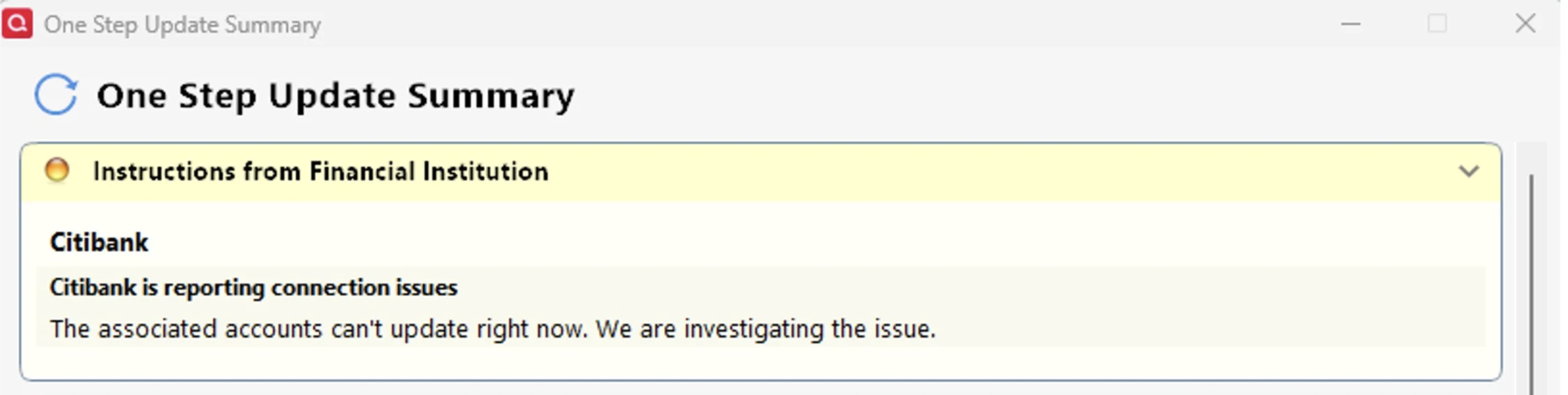 I am curious, what types of accounts are you updating? You could try connecting to a different instance of Citi, like Citi Cards, or Costco Anywhere Visa Card by Citi…