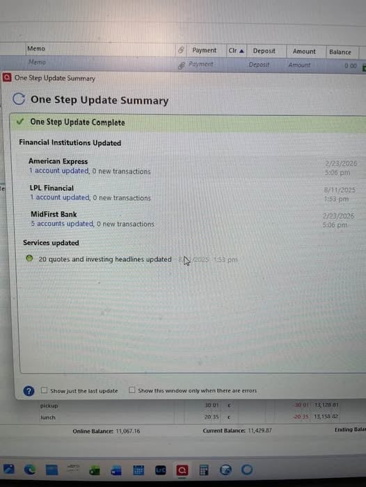 Good morning, and yes, it is a GOOD morning, it worked perfectly all 5 accounts for MidFirst updated!! Thank you, Kristina for all your help and patience getting my problem fixed. You provided real customer service, thanks again and have a good day.