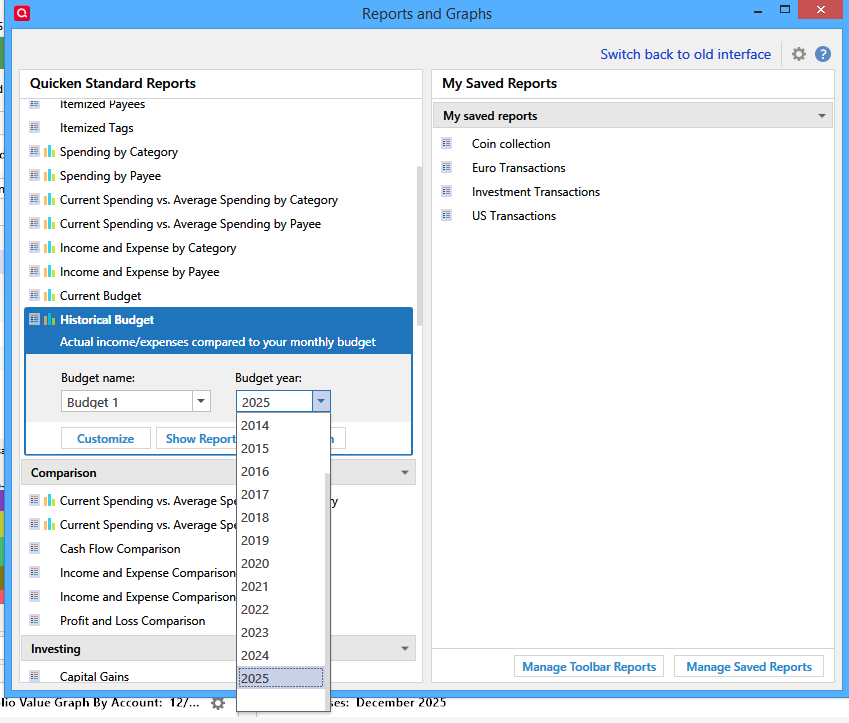 Is this the view you are talking about? My Historical Budget report seems to default to the current budget year every time I select it from the Reports & Graphs Center
