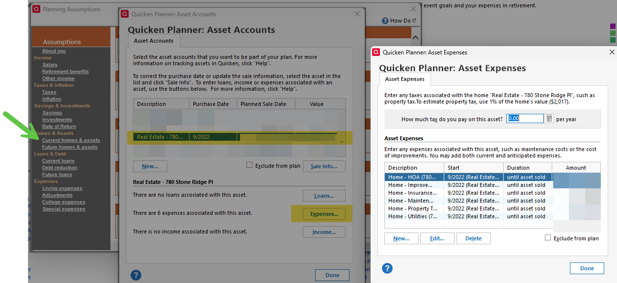 2. If you want to include the new deck budget expense under that house asset in LTP, then go to LTP's planning assumptions>current homes & assets, select your home in the table and click expenses and enter it there. See image 2.