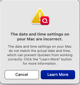 The date and time on my Mac OS Monterey 12.7.6 is set automatically, and shows the correct time and location. However Quicken Classic Deluxe Version 8.3.3 chronically posts this error. Quitting and restarting Quicken, rebooting the Mac - nothing stops this wrong message from appearing many times each work session. I'm tired of pressing Cancel to continue my work. Is there a fix or work-around?