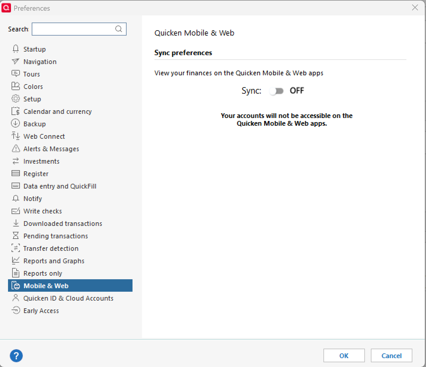 One thing I’d like to check: do you use the Quicken mobile app or Quicken on the web at all? If you don’t use those services, I suggest making sure Mobile & Web Sync is turned off: