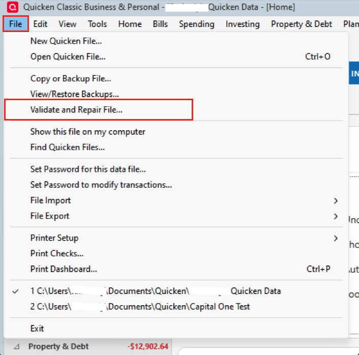 Note that if you find that the issue no longer exists in the copy file and wish to remain in this file, you will need to reconnect all of your connected accounts in Quicken. If you choose to return to your original file, you can do so by going to File and selecting the second file listed at the bottom of the menu choices.
